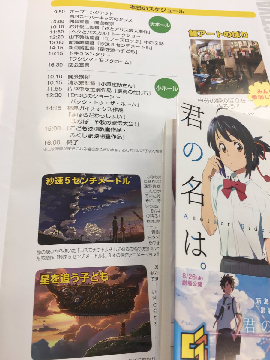 福島こどものみらい映画祭in白河市コミネス。15時から映画音楽制作補助でお手伝いしたこども映画教室の上映前に舞台挨拶。大ホールでは新海誠作品の上映が始まります! https://t.co/7HqKnEaaum